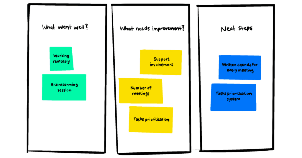 Divide the whiteboard into three columns and label them “What Worked Well,” “What Needs Improvement,” and “Next Steps.”