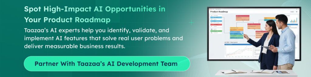 Taazaa specializes in helping product teams identify, validate, and build AI features that solve real problems and deliver business results. Our AI development experts work alongside your team to turn strategic vision into production-ready solutions.